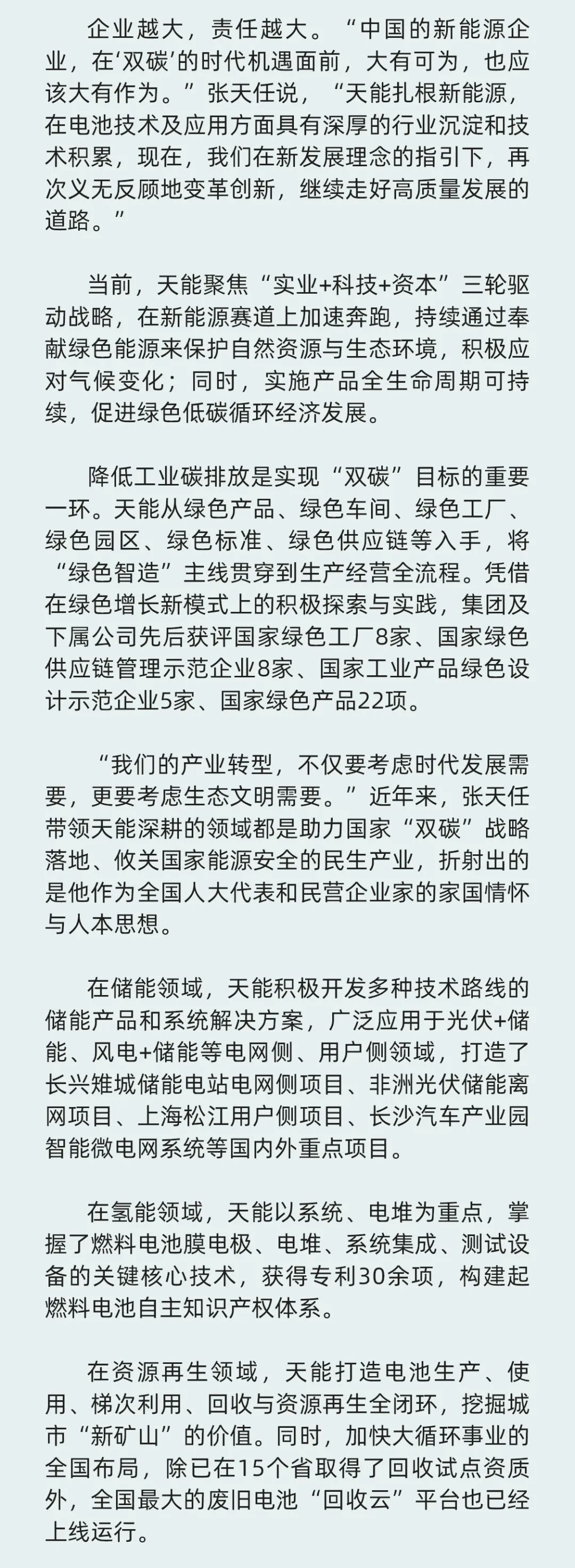 全国“两会”正在进行中,全国人大代表、yabo.com控股集团董事长张天任提出了高质量建设新型储能体系、尽快出台强有力氢气补贴、加强回销一体化示范项目推广、鼓励各类电池技术平行发展等具体建议,为推动能源转型,守护绿水青山积极建言献策。